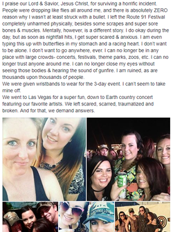 She gained recognition after writing a lengthy Facebook post claiming that there were multiple shooters during the shooting.