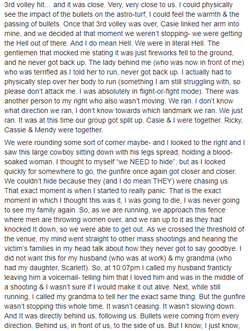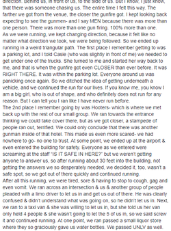 I kept looking back expecting to see the gunmen and I say MEN because there was more than one person. There was more than one gun firing. 100% more than one.