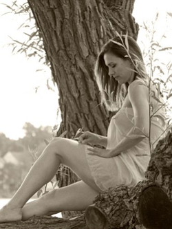 Sepia toned photo of Lauren Stuart where she is up in a tree.