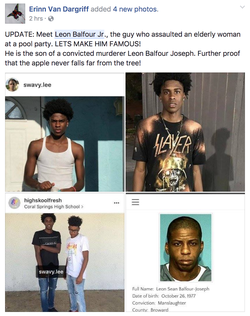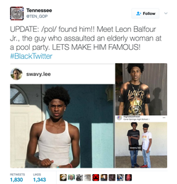 Leon Balfour Jr. is a young man in his late teens who resides in North Fort Lauderdale and Pompano Beach area in the state of Florida. He is known around the internet for being the young man in the red shirt who indecently throws elderly woman, Nancy James, into a pool along with her dog during a big party.