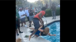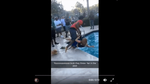 He then picks himself up quickly, drags Susan and picks her up enough to throw her into the pool.