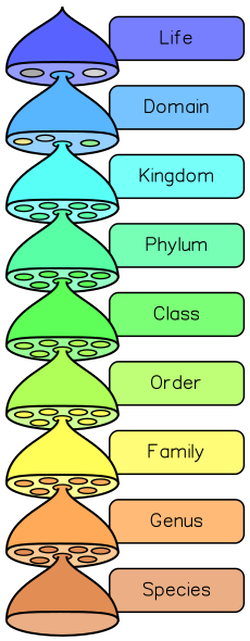 Life is usually classified by eight levels of taxa—domains, kingdoms, phyla, class, order, family, genus, and species.