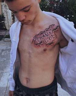 Lil Mosey showing off his "Thank God" tattoo on his chest