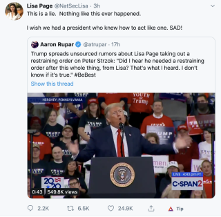 On December 10th 2019, at a rally in Hershey, Pennsylvania Donald Trump claimed, without evidence that Page had taken out a restraining order against Strzok: [27]