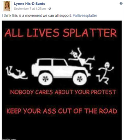 Lynne's meme reads, "All Lives Splatter", and at the bottom of the meme, it also reads, "Nobody Cares about your protest.
