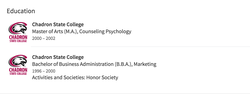 Lynne DiSanto received her degrees at Chadron State College. She received degrees in Bachelor of Business Administration in Marketing, and her Master of Arts in Counseling psychology. [8]