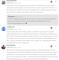 A number reviews of Mafia City in the Google Play store are sarcastic stories of Mafia City's amazing gameplay and how Mafia City turned their lives around for the better.