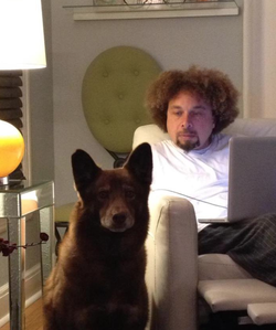 Malcolm with his dog as he works on his laptop.