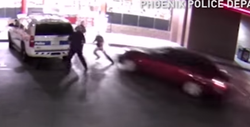 "The officers all tried to run away and it looks like one just missed being squished between the police car and the suspect's car," said Phoenix police Sgt. Jonathan Howard.