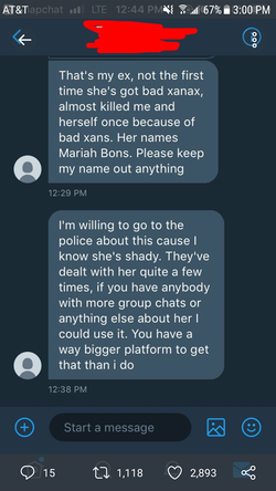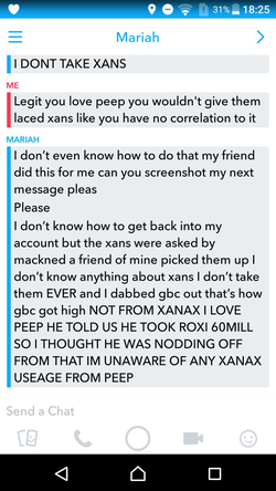 After Peep's death, Mariah summarized what happened in a Snapchat. She said that Mackned asked for xans, a friend of hers picked them up and brought them to Gbc. She also said that Peep took 60 milligrams of roxi, a form of Oxycodone before, and she assumed he was nodding off from that. She states that she was unaware of any Xanax usage from Lil Peep. [2]