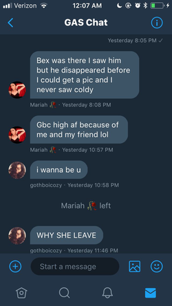 At 10:57 pm, Mariah sent another message to the group and said "Gbc high af because of me and my friend lol."