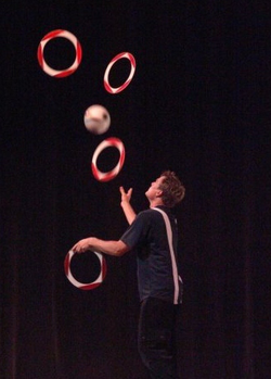 Since winning the International Juggling Championships Mark has taken his one man show to thousands of venues around the world, including The Kennedy Center and Lincoln Center for the Performing Arts, 3 times.