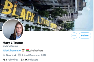 Mary L. Trump is active on Twitter, where she has a following of over 23,000 under the account "@MaryLTrump". In her bio she states that she supports the Black Lives Matter movement. [7] She joined Twitter in December 2012. [7]