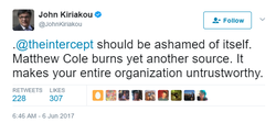 His most recent source, Reality Winner was outed when the invisible ink on the files he published were recognized. In the past, Cole was involved in another story with John Kiriakou, in which John ended up serving 2 years in prison because he was not properly protected.
