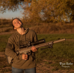 Maycee Barber with a sniper rifle