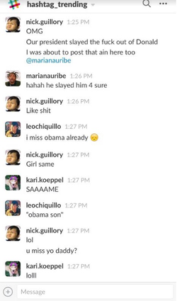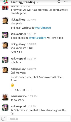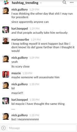 In a leaked group conversation for work titled "hashtag_trending," Maycie said "maybe someone will assassinate him."