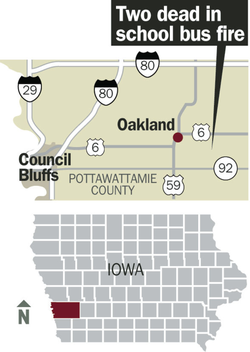 Photo of the bus that was ablaze and took the life of Megan Klindt and the bus driver, Donald Hendricks- just outside of the farm where Klindt lived.