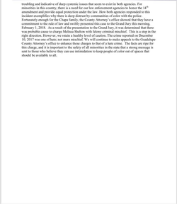 We will continue to make appeals to the Guadalupe County Attorney’s office to enhance these charges to that of a hate crime.