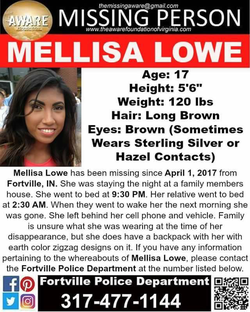 On April 1st, Lowe was staying at a family member's house in Fortville, Indiana. She went to bed at 9:30 pm while the family member went to bed at 2:30 am. The next morning she was gone, leaving behind her cell phone and vehicle. She possibly is in possession of an earth color zigzag backpack.