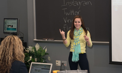 Meredith Sullivan Chapman presenting in front of a college classroom.