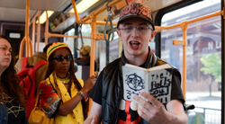 Photo of Micah holding a book of poetry inside of a bus.