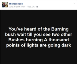 Michael Tate Reed is resident of Van Buren, Arkansas. Twice in three years he has driven a car into Ten Commandments monument at state capitol buildings. He livestreamed on Facrbook his 2017 crash into a Ten Commandments monument erected the day before at the state capitol in Arkansas. He shouted "Freedom!" before impact.