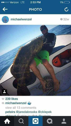 Michael Wenzel posted a photo of himself pouring beer into the mouth of an Atlantic goliath grouper also known as a jewfish while Bo Benac held the fish. Atlantic goliath grouper are a protected species.