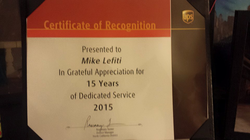 Photo of Mikes' 15 years of service award from UPS