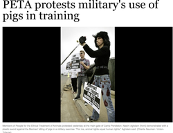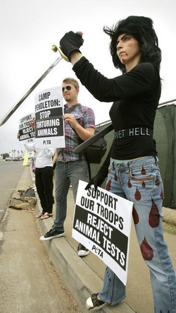 Aghdam (with a plastic sword) representing the People for the Ethical Treatment of Animals and protesting at the main gate of Camp Pendleton (photo taken on August 12, 2009; credit: Charlie Neuman/ San Diego Union Tribune )