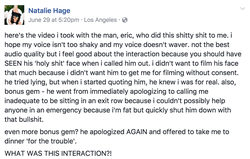 On June 30, 2017, Natalie Hage was on a flight to Los Angeles, California when a man named Eric sat next to her. The man began texting to a friend insulting words about Natalie; she took a photo as a way to have evidence. Hage also caught the interaction with the man and she confronted him about what he wrote. Eric said that he was drunk.