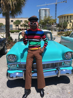 Photo of NewAge Jerkboy where he stands with a classic car from the 1960s era.