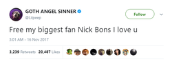 On November 16, 2017, the day Lil Peep died, he posted his last tweet: "Free my biggest fan Nick Bons I love u."[1]