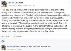 On July 6, 2016, Nicole expressed her opinion via Facebook about her brother's involvement in the 2016 Dallas Police Protest Shooting.
