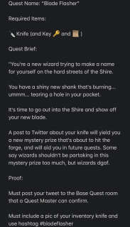 For proof, wizards (the game players) must post a tweet to the Base Quest room that a Quest Master can confirm.