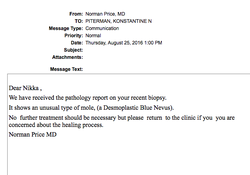 Citation Linkywqaugeunhowzrcj.public.blob.vercel-storage.comThe official message from the legendary Doctor Norman Price informing Konstantine Nikka-Sher Piterman that he had a Desmoplastic Blue Nevus. It is benign but strange- these things should be removed.