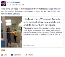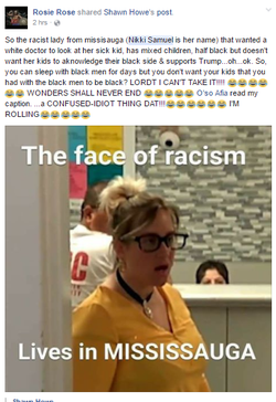 Nikki Samuel is a resident from the city of Toronto, ON who on June 18, 2017 was video recorded making racist comments and asking for a 'white doctor" to treat her son at a Mississauga, Canada clinic. The video went viral and has received over 21 million views and 300,000 shares on the Daily Mail's Facebook page alone.