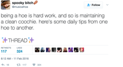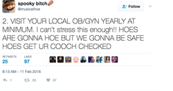 Some time in early 2016, Noelle decided to create a thread on Twitter where she shares tips on how to be a more successful "hoe". Her posts on twitter are rather ways in which sexually active women can better take care of themselves and their bodies. [undefined]