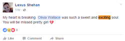 On January 7, 2017 Olivia Wallace died in a car crash in Preble County, Ohio after losing control of her car and crashing into a tree.
