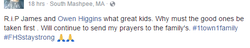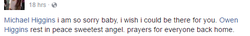 On the evening of December 22nd, Owen and his friend James Lavin were driving home from hockey practice. At around 6:42 pm, their vehicle crashed into a tree on Thomas Landers Road. Lavin died from his injuries while Higgins was flown to the hospital. Several Facebook posts mistakenly indicated that Owen died in the crash, but Police confirmed that Owen was on life support. He later died from his injuries. The authorities are investigating the incident