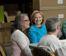 [4]While participating in a workers' roundtable discussion with Hillary Clinton in Keene, New Hampshire, Pam brought up the issue of substance abuse and her personal family history of struggles with addiction - particularly that of her daughter's.