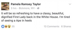 Pamela had posted, "It will be so refreshing to have a classy, beautiful, dignified First Lady back in the White House. I'm so tired of seeing a Ape in heels."
