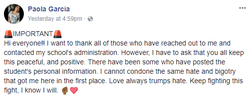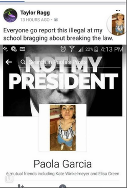 Garcia's YouTube video telling her story about the threats she received; she calls for Taylor Daggs' expulsion Hello, my name is Paola Garcia. I'm a senior at Transylvania University in Lexington, Kentucky. I'm undocumented and a recipient of DACA.I'm scared of what my future holds, because [?].My parents and I have been living here since I was 2 years old. 19 years later, America still doesn't feel like a home to me. I've dealt with Racism, discrimination, Threat s, name calling, just blatant ignorance. But I usually suck it up, bite my tongue, and let it go.I've never asked for help, but that's what I'm gonna do now.Threatening post from Taylor Ragg. Over the summer, a student at Transylvania University posted me on a racial hatred page called the 10th Crusade Enthusiast with a comment, "Everyone go report this illegal at my school bragging about breaking the law." hat night, I received numerous messages on Facebook from members of that group, threatening me with [?] Someone actually sent me pictures of him filling out a [?] form to Homeland Security. And I received messages like, "I can't wait 'til you're fucking cunt ass is gone," "You and your N-word boyfriend need to leave," and "Hope you enjoyed your visit. Back to the dirt floors of your homeland, stinky ass." So, I took screenshots of everything and reported it to the administration. But, according to them, it doesn't-- his actions don't violate the school's non-discrimination policy. If you read it, it's obvious that he did. And it just doesn't make sense to me how that was their conclusion. Their reasoning was that, "Mr. Ragg reposted your comment with recommendation to readers about how to respond to it," talking about my bio, which said, 'Undocumented, unapologetic, and unafraid.' I'm trying my best to explain the real threat that deportation has been to me and my family. And not only that, but racism emboldened today. And he's inciting them to harass me and report me. He's still here, and I have to see his face every day. It's such a small campus. I ask that you guys contact my school's administration and ask for Taylor Raggs's expulsion. Because hopefully, we as a group can do something, because being on my own isn't enough. I'll post contact information, links, and details with this video. And I want to thank you guys for taking the time to listen and to help me. It means the world to me right now.