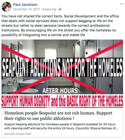 In late 2017, and in early 2018, Jacobson started an initiative to stop the residents of Cape Town helping the homeless.