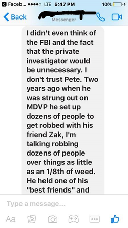 [4]He has been addicted to Bath salts (drug). [2]A person who knows Pete has said that she does not trust him and has robbed multiple acquittances for drugs. [2]He held his best friend and knifepoint for an ounce of MDMA. [3]