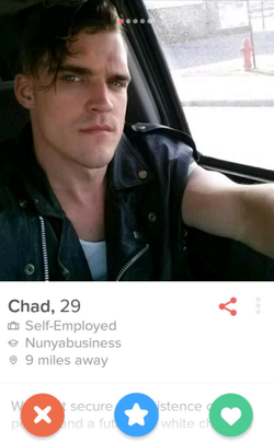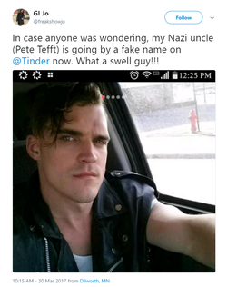 [9]On Tinder, he goes by the name "Chad." [10] [11]His Facebook pictures show support for the ideas of Traditionalism, White nationalism, and the Alt right. [6]In August 2017, Pete inquired his friends of Facebook about speaking at a rally as a pro-white civil rights activist and open a dialogue at an anti-hate event. [8]