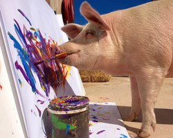 Joanne gave the pig a paintbrush and began to paint away at the nearby canvass.