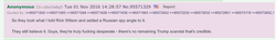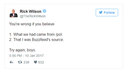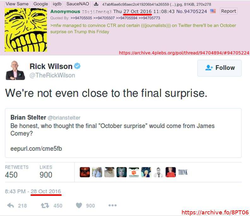 A post on 4chan on January 10th claims that the dossier published by BuzzFeed was an elaborate hoax. [3] [12] [28] The elaborate troll was allegedly started back in October when a post on 4chan on October 26 stated: “mfw managed to convince CTR and certain (((journalists))) on Twitter there'll be an October surprise on Trump this Friday.” [3] On October 29th, another 4chan post claims that someone with a fake Hillbot account convinced Rick Wilson that he had a damaging tape concerning Trump and preyed on Wilson's wishful thinking. [33] On November 1st, another post said “So they took what I told Rick Wilson and added a Russian spy angle to it. They still believe it. Guys, they're truly fucking desperate - there's no remaining Trump scandal that's credible.” [13] [3]