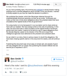 Editor-in-Chief Ben Smith tweeted an email he sent to staff on his decision to publish the story because he wanted "Americans to make up their own minds about the allegations about Trump that might have circulated in the highest levels of government."