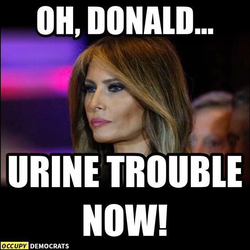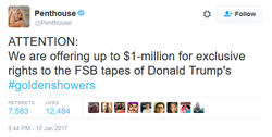 The dossier says that Trump booked the Presidential Suite at the Ritz-Carlton hotel in Moscow that he knew Barack Obama and Michelle Obama stayed in. The document continues on to say that to spite them, he hired a number of prostitutes to perform 'golden showers' (urination) on the bed in front of him. The room is said to be compromised by the FSB with microphones and concealed cameras. [5] Penthouse Magazine is offering $1 million dollars for the exclusive rights to Donald Trump's golden showers. [11]
