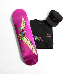 The box includes: Skate Deck, Wheels, Griptape, T-Shirt, Wax